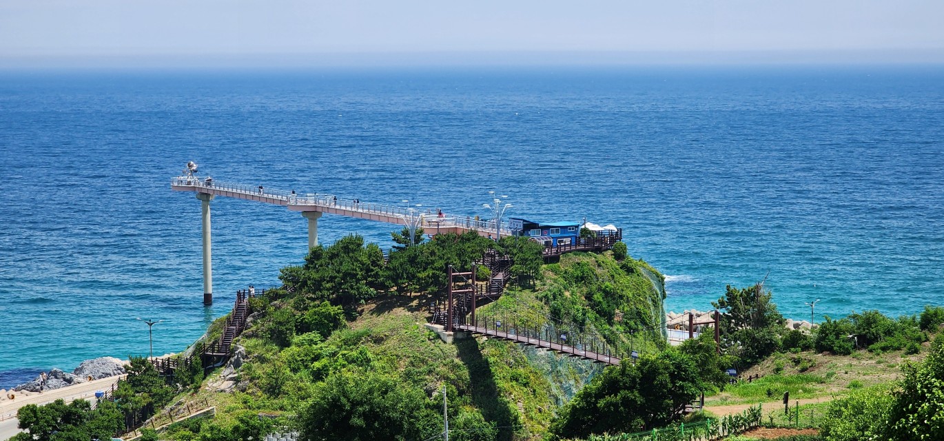 파도 또한 강원도의 바다와는 다르게 부드럽고 해산물도 대게를 키울 만큼 넉넉함을 자랑한다. 울진의 첫 인상은 청정함 그 자체이다. 산과 바다 그리고 하늘까지 푸른빛으로 수놓은 모습을 보고 있는 것만으로도 힐링이 되는 그런 고장으로 내게는 단단히 각인되어 있기에 그 먼 길을 마다하지 않고 찾게 되는가보다. 후포 항에서 멀지 않은 등기산 스카이워크가 위치한 지형이 아주 탁월했다. 뒤로 낮은 등기산이 함께 자리 잡고 있어 외롭지 않았다. 해안가에서 바다를 향해 똑바로 뻗은 구조물 형상이 경상도 사나이의 마음을 닮았다. 말을 돌리지 않고 돌 직구를 날리는 경상도 사내의 마음을 은연 중 암시하고 있는 듯했다.