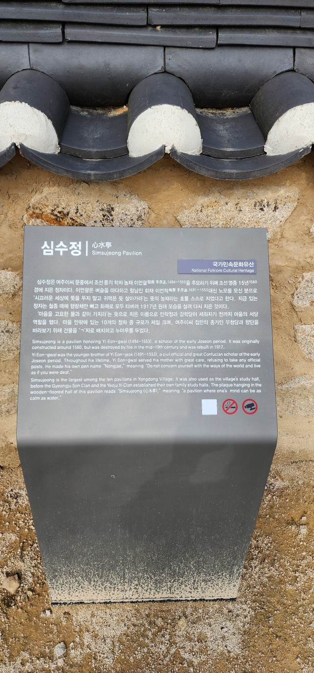 심수정(心水亭)은 벼슬길을 마다하고 형인 회재(晦齋) 이언적(李彦迪)을 대신하여 어머니를 극진히 모신 동생인 농재(聾齋) 이언괄(李彦适, 1494~1553)을 추모하여 지은 정자로 1560 년경에 세워졌지만 화재로 소실 된 것을 1917년에 다시 지었다고 한다. 농재란 “번잡한 세상에 뜻을 두지 말고 귀먹은 사람처럼 살아 가겠다”는 생각을 담아 이언괄 자신이 직접 지었다고 한다. “마음을 물과 같이 가지라”는 뜻이 담긴 심수정이라는 이름과 더불어 이언괄의 마음 세계를 짐작 할 수 있었다. 거대한 고목으로 자란 회화나무가 집을 삼킬 듯이 담장에 바짝 붙어 자라고 있어 조금은 기괴한 모습이지만 정자에서 바라보는 풍경은 아주 그만 일 듯싶었다.