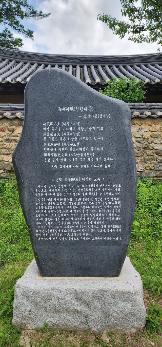 성종시절의 대학자인 정여창 선생(1450-1504)은 영남 사림파의 영수 김종직의 제자로 성리학의 대가로 인정받아 이황, 조광조, 이언적, 김굉필 등과 함께 동방오현(東方五賢)으로 알려진 분이다. 안타깝게도 무오사화(1498년)에 연루돼 유배지인 함경도 종성에서 생을 마감했고, 죽은 직후에 터진 갑자사화(1504년) 때는 부관참시까지 당하는 수모까지 겪어 말년과 사후가 순탄치 못했지만, 사후 복권 되어 1568년(선조1년) 문헌공(文獻公)이라는 시호가 내려졌고 연산군 2년(1610년)에는 성균관과 향교 문묘에 신주가 보관돼 성리학자로서 가장 큰 영광을 누렸다.